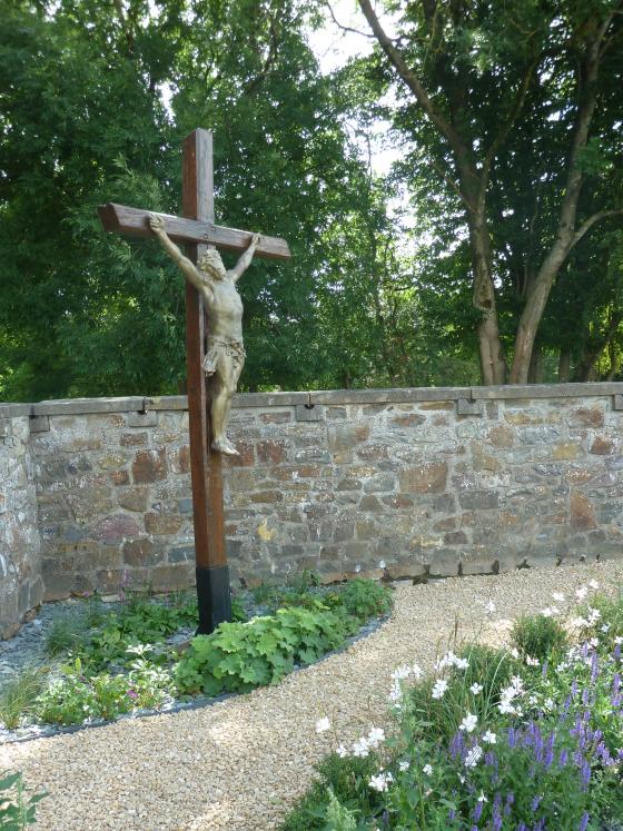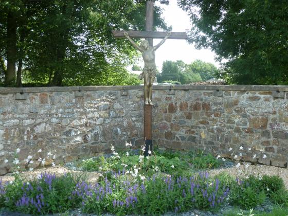 Afin de mettre en valeur le calvaire, les deux massifs de Thuyas ont été supprimés. Une zone en arc de cercle est dessinée par une bordure, et permet de délimiter l’endroit. Un banc est placé en face du calvaire afin de permettre aux visiteurs de venir s’y recueillir. Une zone de plantation composée de vivaces et de graminées, décore le bas du calvaire. Les graminées, avec leur feuillage, apporteront de la verticalité au parterre ainsi qu’une structure en hiver. Les vivaces au tons rose-bleu, sont choisies pour offrir une floraison étalée tout au long des saisons. En hiver, les bulbes offriront une source de nourriture aux pollinisateurs. Finalement, la proposition d'un alignement de Tilleuls pallissés n'a pas été retenue pour des raisons budgétaires et d'entretien.