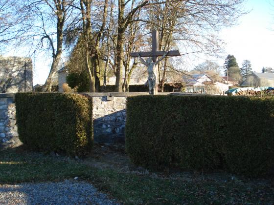Le calvaire est situé dans un coin du cimetière, adossé au mur périphérique. Les haies de Thuya qui se situent de part et d’autre de celui-ci, sont devenues très massives avec le temps et cachent la vue sur le calvaire. Par leur volume, des dernières ne permettent pas de mettre en évidence le calvaire.