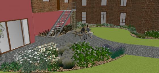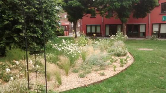 En rencontrant le responsable des travaux et l'éco-conseillère, Ecowal a pris connaissance du projet initial de la commune: créer un jardin des mariés à proximité de la salle des mariages Cete espace devrait également servir comme lieu de convivialité pour le personnel administratif, mais également constituer un lieu de passage. La commune souhaitait que le projet se fasse après les travaux de rénovation du chemin en pavés existant. Ecowal a suggéré en premier de repenser le tracé existant de ce chemin, dont le tracé était peu adapté à la circulation quotidienne. Le tracé depuis l'entrée du jardin a tenu compte du tracé spontané des passants. La table pique-nique existante a été conservée mais disposée de l'autre côté du sentier afin d'offrir un zone ombragée lors du temps de midi. Cette table de pique-nique n'encombrera ainsi pas l'espace réservé au jardin des mariés. Autour de cette aire de pique-nique, des plantations vivaces mi-ombre ont été réalisées le long du bâtiment. Un aménagement a été également préconisé pour atténuer la rampe métallique, visible de depuis l'entrée du jardin. Une structure en bois a été fixée sur la rampe, servant de soutien pour des plantes grimpantes.