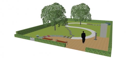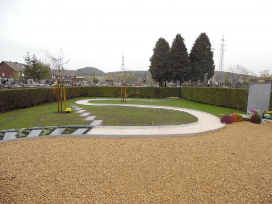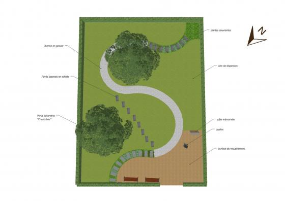 Un sentier en courbe permettra aux fossoyeurs de procéder à la dispersion, pour plus de respect pour les familles. La courbe recouverte de gravier blanc renvoie à la symbolique de la vie. Le début et la fin de la courbe sont agrémentés de plantes vivaces couvrantes au feuillage grisâtre, évoquant la citation "Tu es né poussière, tu retourneras poussière". Ce chemin ne sera emprunté par les fossoyeurs que lors des cérémonies